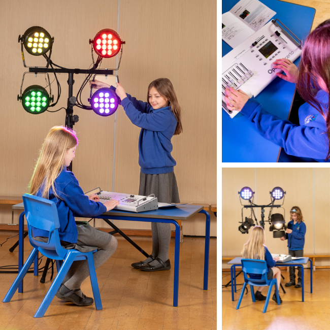 The “Teach & Perform” GCSE lighting kits come with professional-grade lights, the OpusConcerto lighting desk, and an educational workbook to teach students lighting theory.